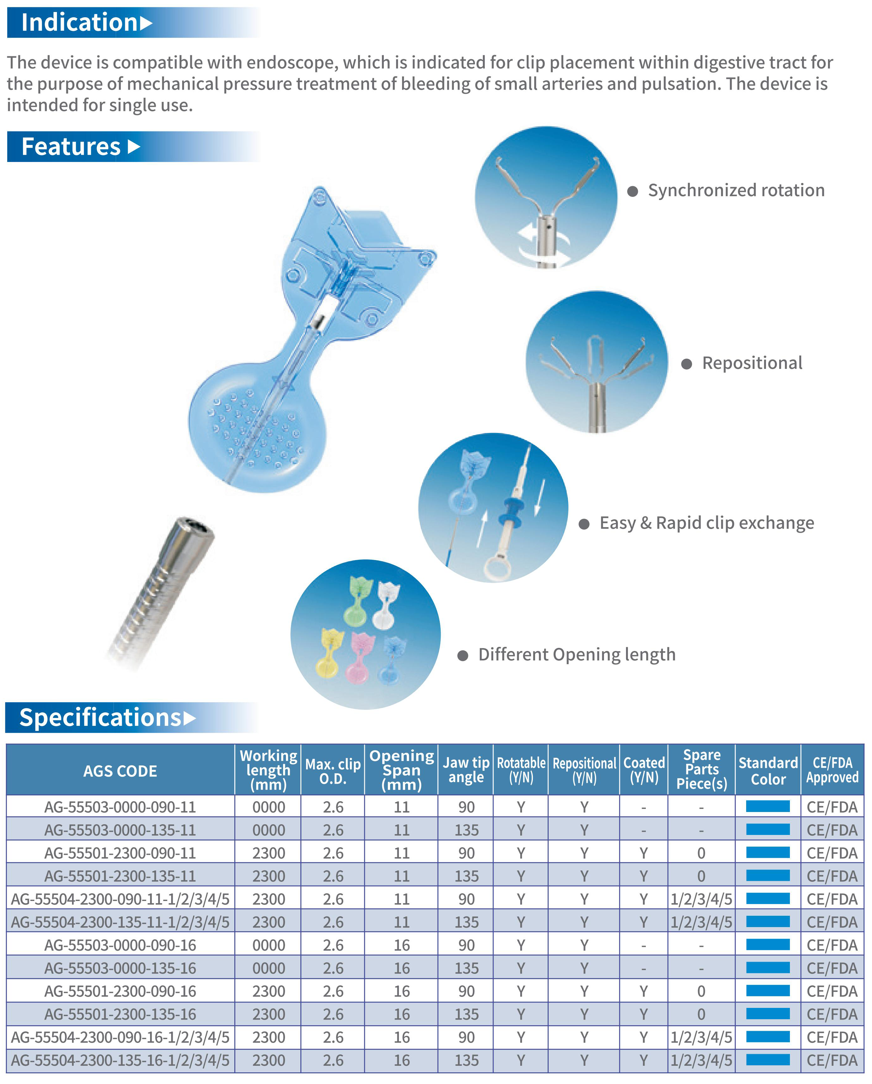 Indication:The device is compatible with endoscope, which is indicated for clip placement within digestive tract for the purpose of mechanical pressure treatment of bleeding of small arteries and pulsation. The device is intended for single use.