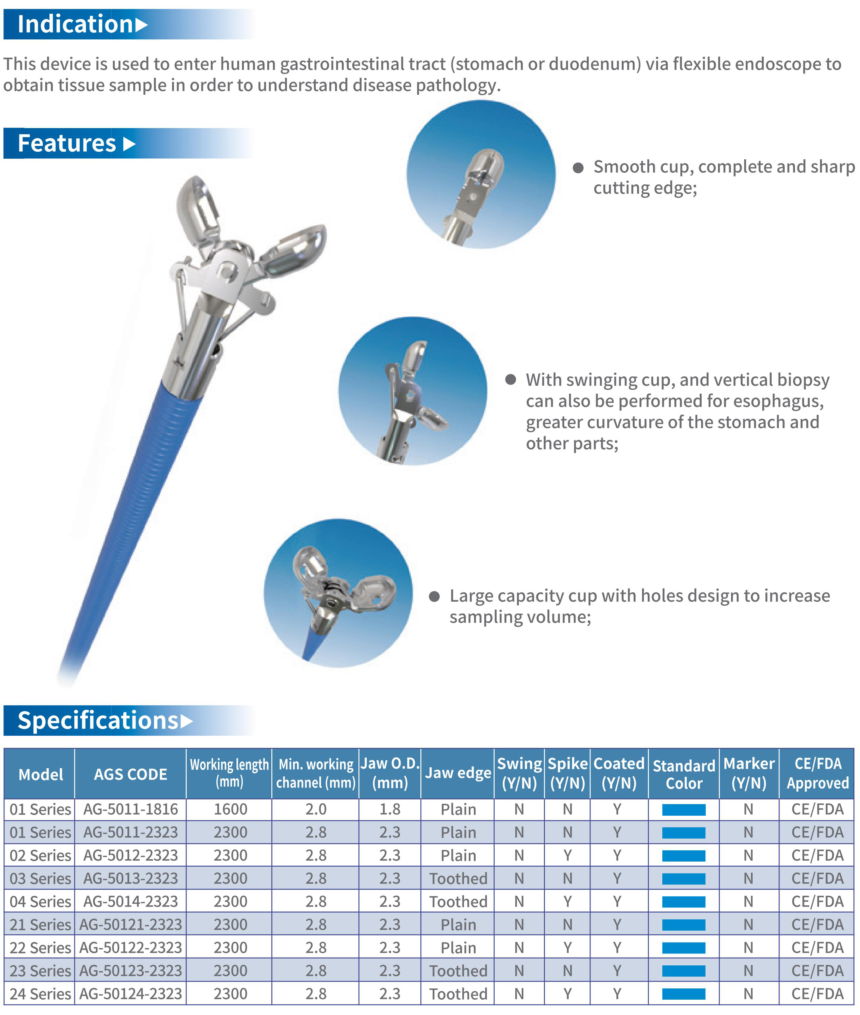 Indication:This device is used to enter human gastrointestinal tract (stomach or duodenum) via flexible endoscope to obtain tissue sample in order to understand disease pathology.